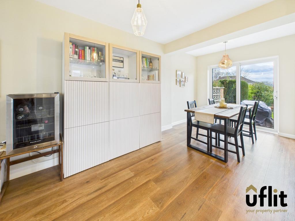 A modern and spacious open-plan kitchen/diner fitted with contemporary wall and base units, compact laminate worktops and tiled splashbacks. Integrated appliances include induction hob to the breakfast bar, double combi oven, dishwasher and fridge/freezer. Plinth heater, laminate flooring, radiator and spotlights to the ceiling. Ample dining space and double doors leading out to the rear garden. Under-stairs storage cupboard, with both side and rear-facing windows filling the room with light. Door to utility.