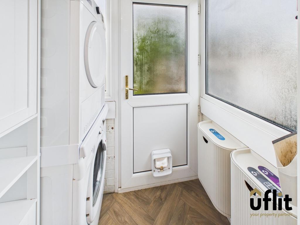 A practical utility space with vinyl flooring, wrap-around windows allowing plenty of natural light, space for appliances and a door giving access to the garden.