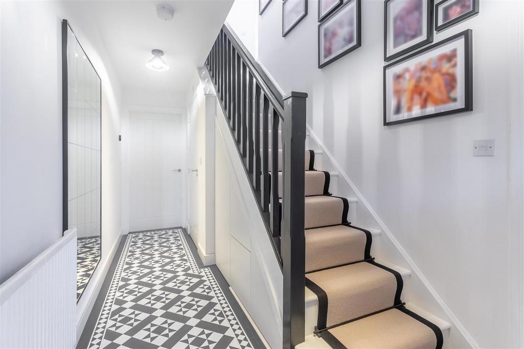 The internal accommodation opens into a welcoming entrance hallway featuring upgraded premium flooring, creating an impressive first impression with a subtle heritage and high-end feel. A convenient WC is tucked neatly beneath the staircase, alongside practically designed under-stairs storage, ideal for keeping shoes and other items out of sight.