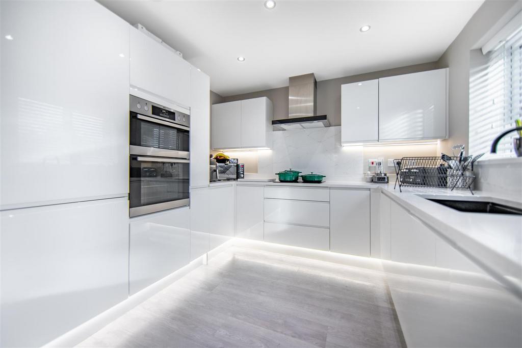 This beautifully presented four-bedroom detached home combines modern design with practical, family-friendly living across two floors. Step inside to a welcoming entrance hallway with a convenient WC, leading to a bright lounge complete with a stylish media wall. Double doors open into a spacious, open-plan kitchen, dining, and living area, perfect for entertaining or relaxing with family. The contemporary kitchen features fitted units and integrated appliances, while two sets of French doors flood the dining and living space with natural light and provide direct access to the rear garden.