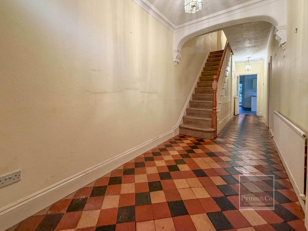 Stepping inside, a long entrance hall sets the tone with its original tiled floor, corbel detailing and large under stairs storage cupboard. The sitting room enjoys a dual aspect, a bay window and a feature fireplace, creating an elegant and welcoming space. Many rooms throughout the house continue this theme of preserved period detail, including ceiling roses and picture rails. The dining room also benefits from a dual aspect, while the kitchen provides a practical arrangement of wall and base units with space for white goods.