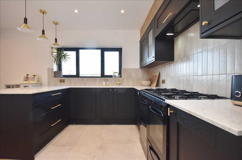Fitted with range of stylish wall, base and display units in black with contrasting quartz worktops incorporating a deep one and a half bowl sink with 4 in one boiling and filtered water tap. Range Cooker with eight gas rings, 2 electric ovens and grill. Integrated fridge, freezer, larder unit and recycling drawer. Ceramic tiled floor. Double glazed uPVC window to rear overlooking garden. Vertical radiator. Ceiling with inset lights. Door to: