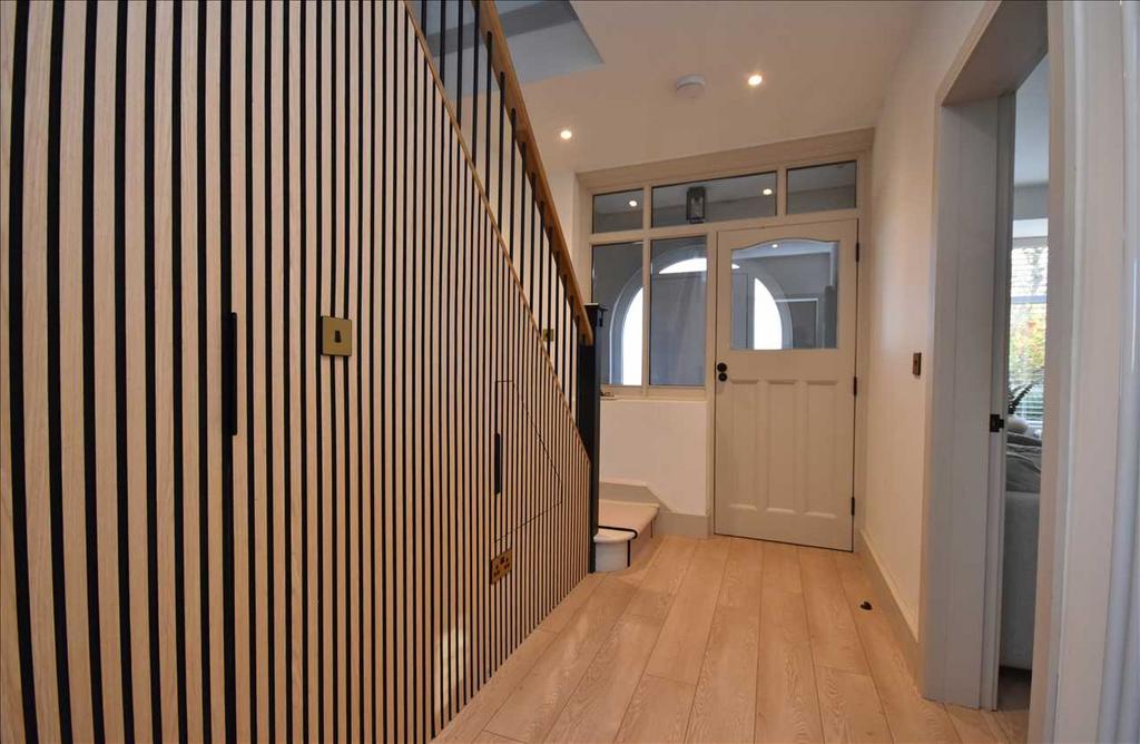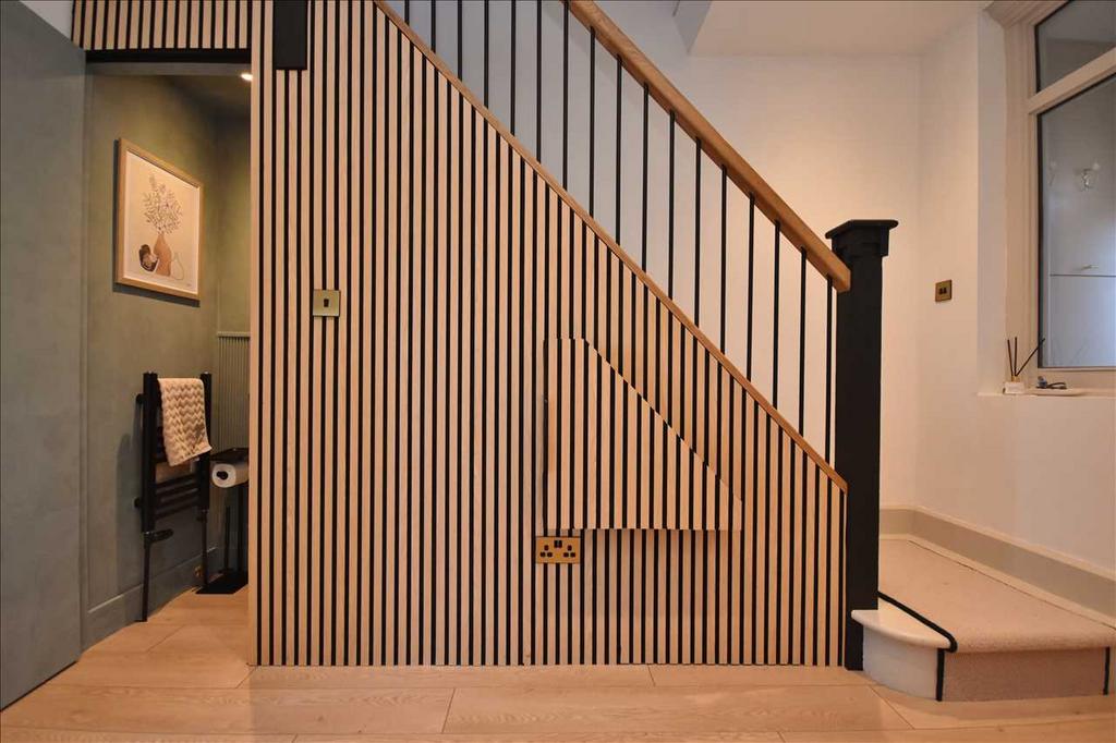 Stylish spindled staircase to first floor with built in storage drawer below. Vertical radiator. Ceiling with inset lights.