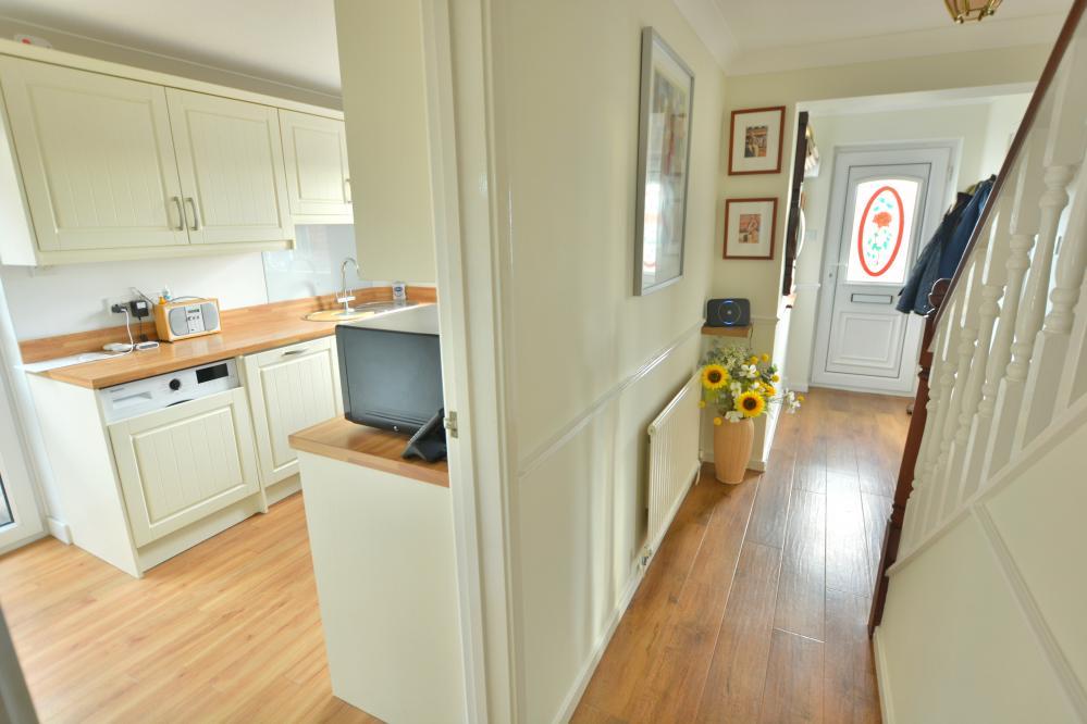 •Kitchen with range of base and eye level units and drawers, complementary worktops and space for appliances, extractor fan, front aspect window and door to side elevation and garden