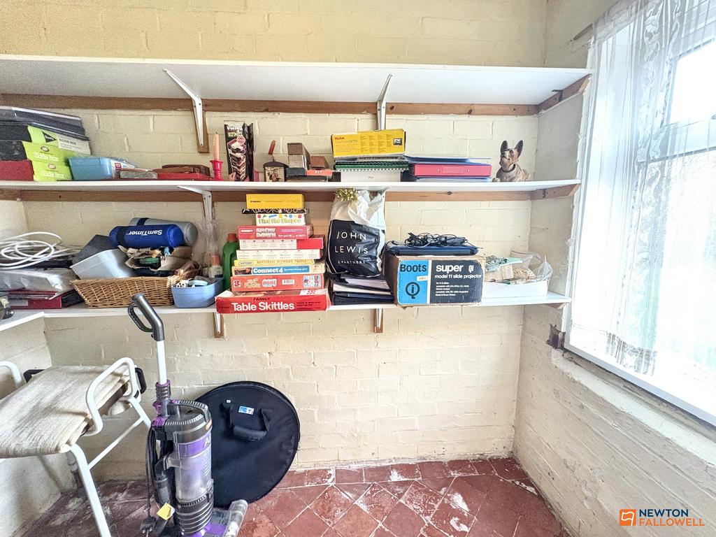 The entrance hall has stairs directly ahead and provides access to the dining room on the right. The dining room enjoys a front-aspect window and an archway at the rear leading through to the kitchen. The kitchen features wooden base and wall units, ample worktop space, an inset sink, and room for a freestanding dishwasher. To the left of the kitchen is the generously sized lounge, which includes decorative brickwork surrounding the gas fire. To the right of the kitchen is a useful storeroom and pantry, which leads through to a dedicated utility room. The utility room is fitted with matching wooden base units, an inset sink and worktops and provides space for freestanding appliances such as a washer and dryer. Adjacent to the utility room is a WC, and an additional store room.