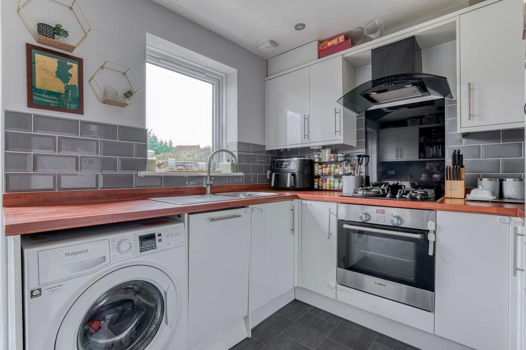 There is ample space for appliances, including a washing machine, dishwasher, and fridge/freezer, and the room benefits from plenty of natural light.