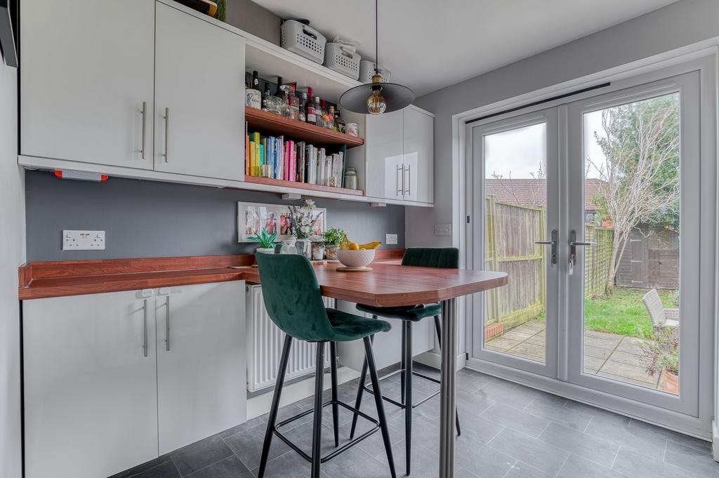 At the heart of the home, the kitchen/diner offers a stylish and practical space, perfect for modern family life. It is fitted with a range of base and wall units, an integrated electric oven and gas hob with extractor, and a four-seat breakfast bar. French doors open out onto the private rear garden, creating a seamless indoor-outdoor flow.