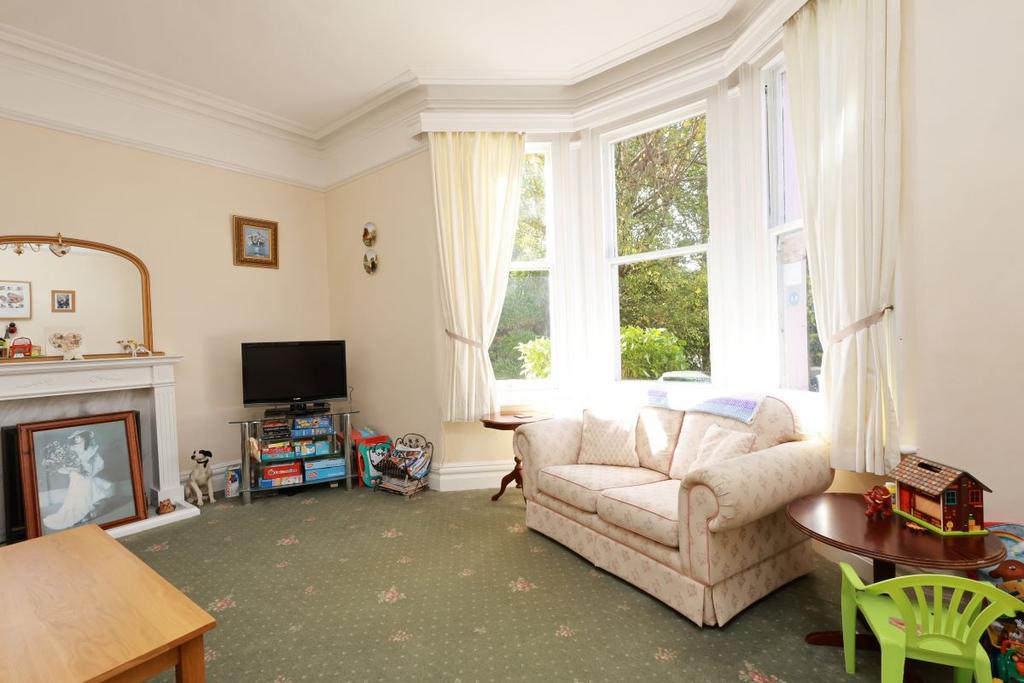 Spacious front-facing lounge with bay window, picture rail, decorative coving, and central ceiling rose.
