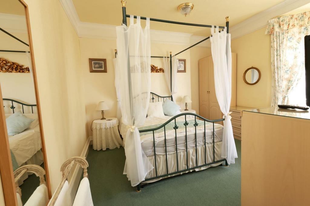 Four-poster double room with bay window seating overlooking front garden. En-suite shower room.