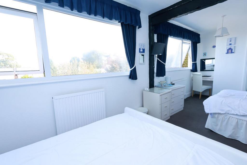 Family room with double and single beds. Uninterrupted sea views across the bay.