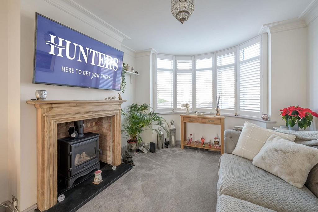 Lounge - 3.58m x 3.28m (11'9 x 10'9) - With double doors leading from kitchen diner, feature fire place with wood burning stove, space for seating, coving and ceiling rose, double glazed bay window to front with bespoke fitted shutters and a column central heating radiator.