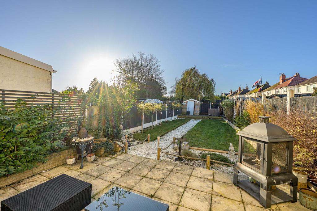 Garden - With a double glazed door leading from kitchen diner to a patio seating area, well maintained lawn, decorative chipping stones, further decked seating area, shed, outside tap and gated side access leading to the front of the property.