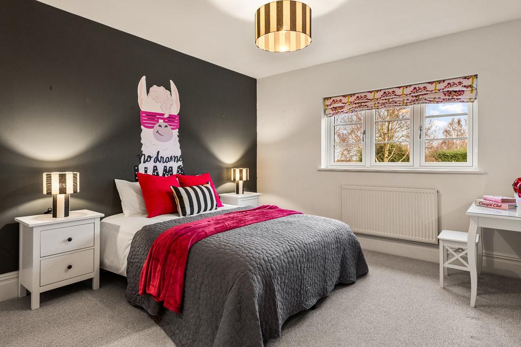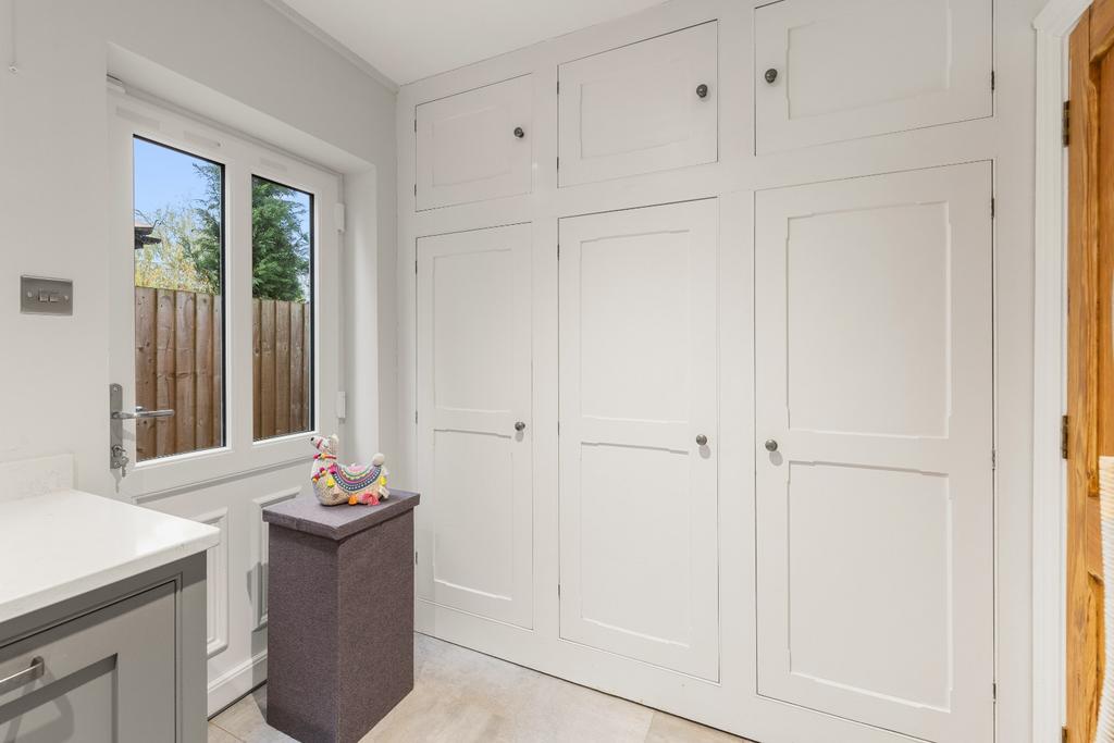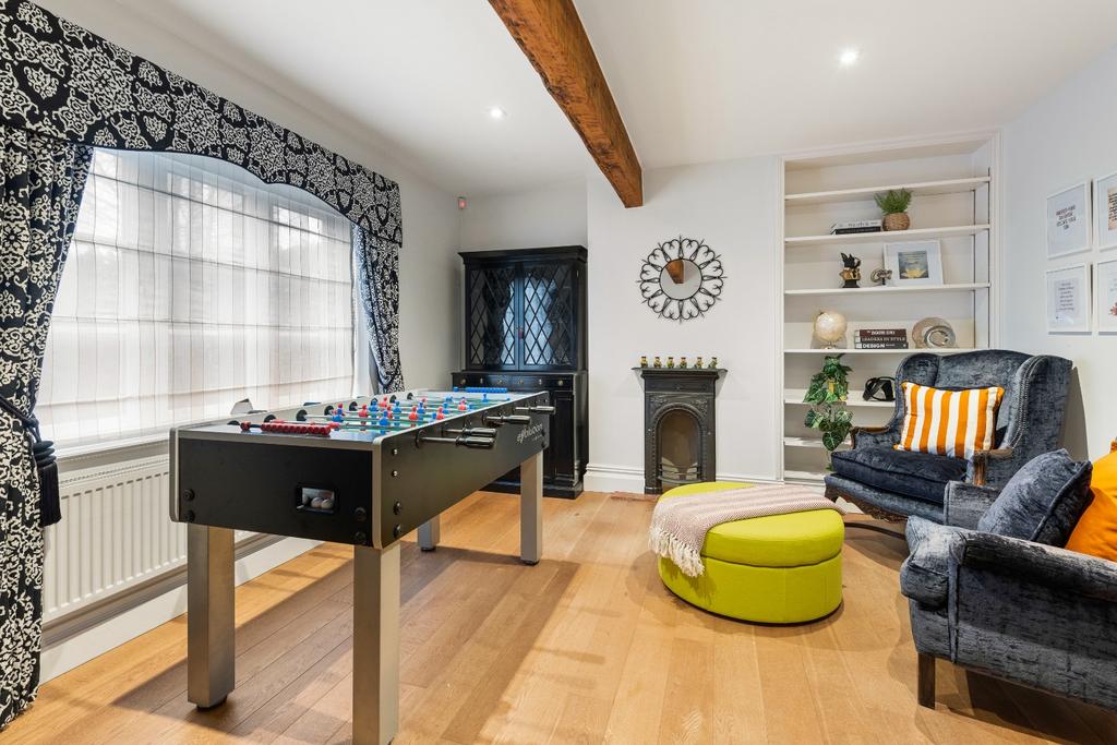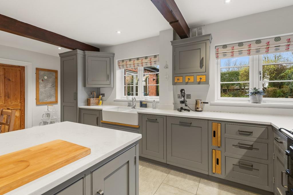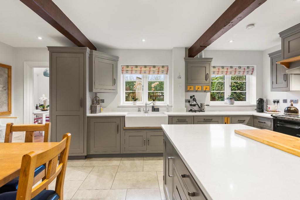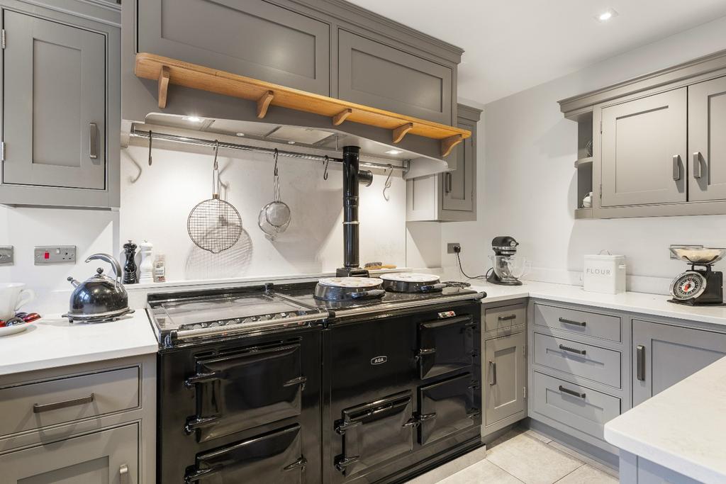 The handmade kitchen forms the hub of the house with bespoke cabinetry, quartz worktops, twin Belfast sinks and a triple Aga. A central island and dining area make it well suited to family life and entertaining, and the adjoining utility room and store provide further practical space. At the rear, the garden room stands out with a vaulted ceiling, exposed beams and French doors opening to the terrace and lawn.