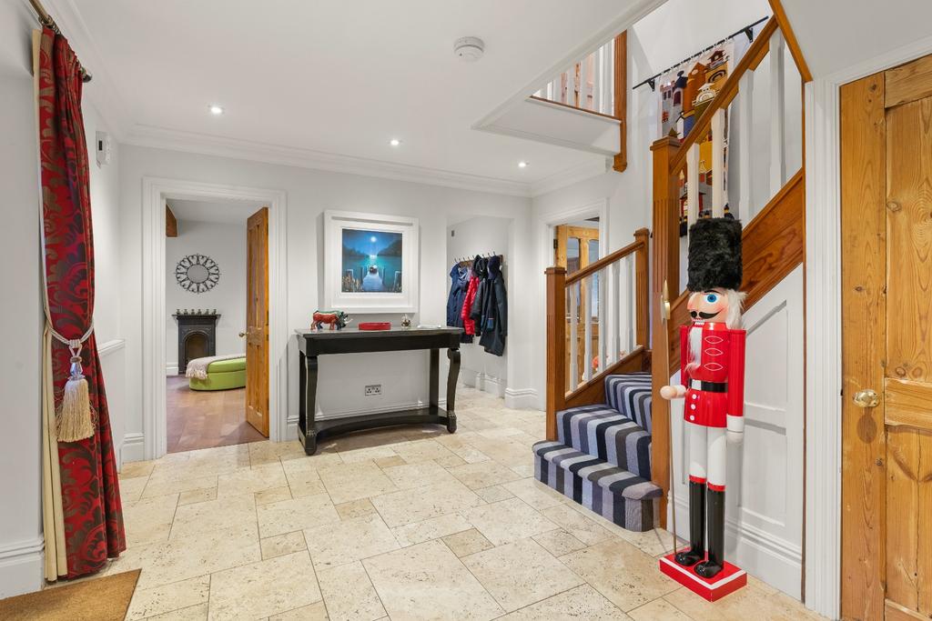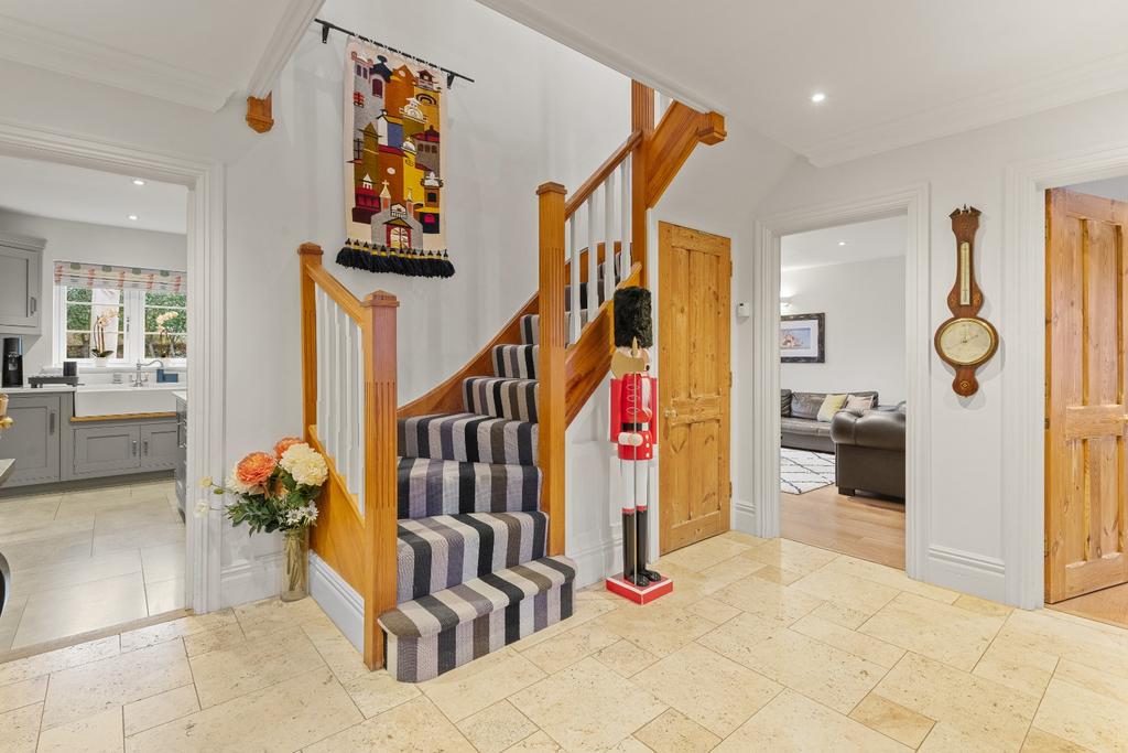 The reception hall creates an immediate sense of scale with tiled flooring, feature windows and an oak staircase rising to the galleried landing. From here the ground floor leads into a series of bright and well laid out rooms. The main sitting room offers two seating areas and an open fire with a limestone surround. To the front is a snug, ideal for day-to-day use, and a separate study for those needing a quiet workspace.