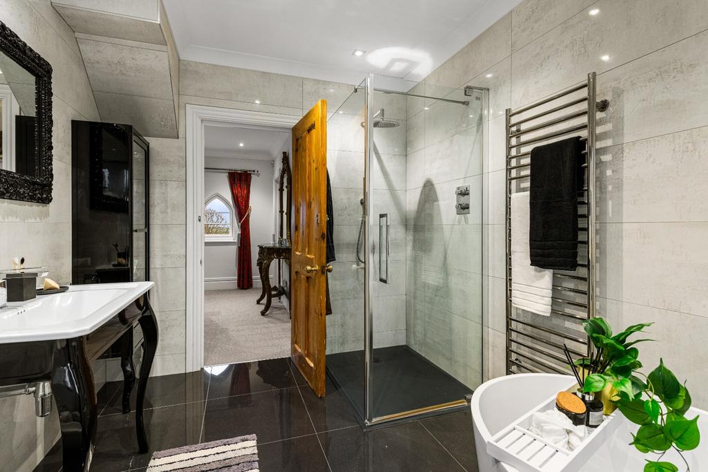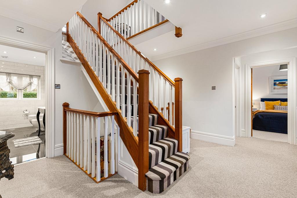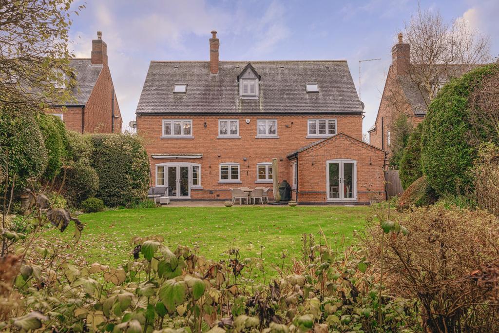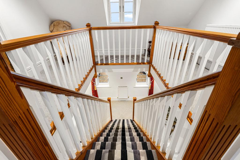 The first floor is arranged around a wide landing and offers four double bedrooms. The principal bedroom includes fitted wardrobes and an ensuite shower room with twin basins. Bedroom two has its own dressing area, and the remaining rooms are served by well appointed bathrooms.