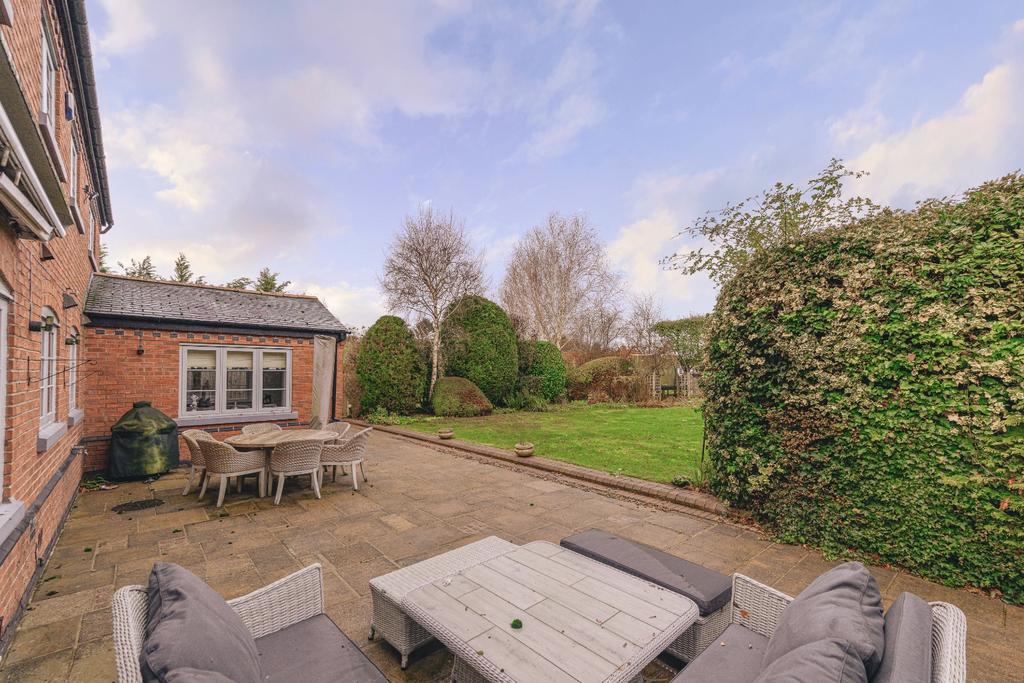 The gardens wrap around the house with a large terrace leading out from the garden room and wide stretches of lawn bordered by mature hedging. The setting is private with open countryside beyond. A detached double garage with an adjoining workshop sits to the side and the drive provides ample parking.