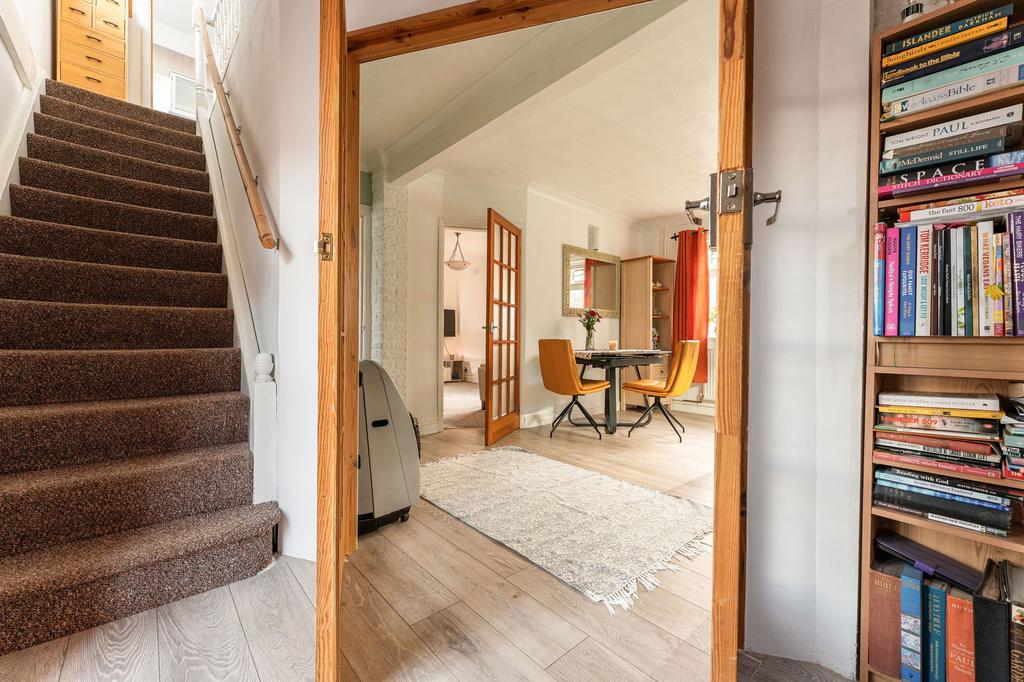 Having stairs leading to the first floor, radiator, laminate flooring.