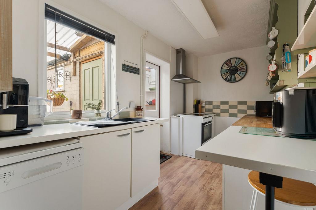 With a range of wall and base units, sink unit, space and plumbing for dishwasher, radiator, flooring, double glazed window to the rear and door to: