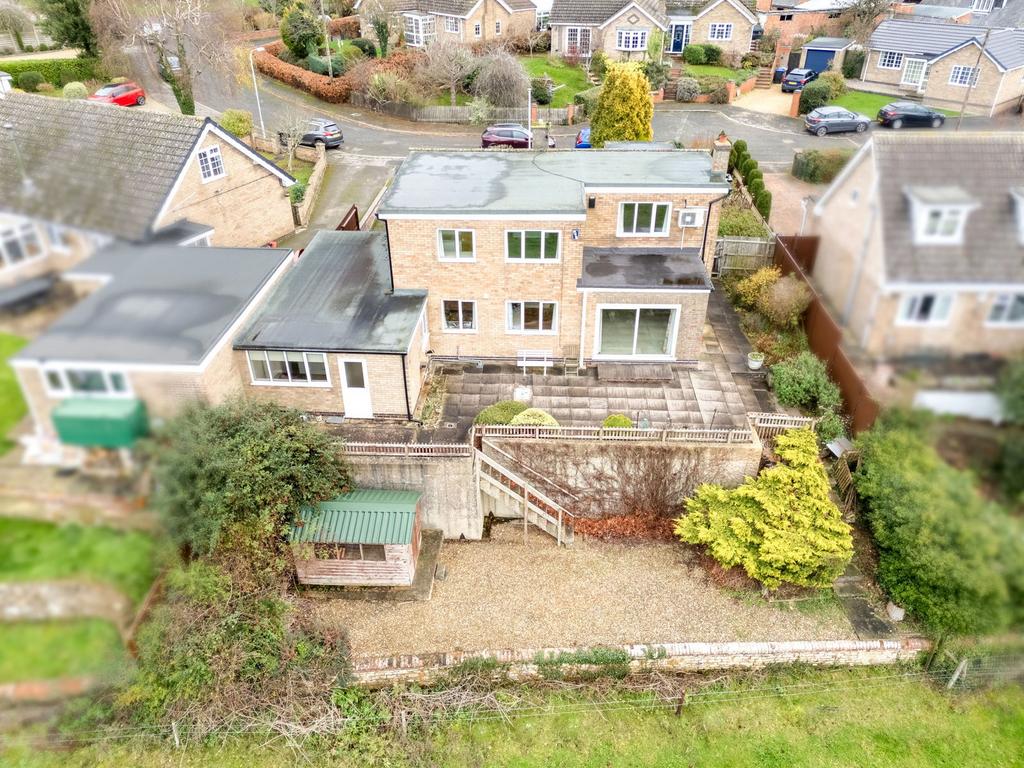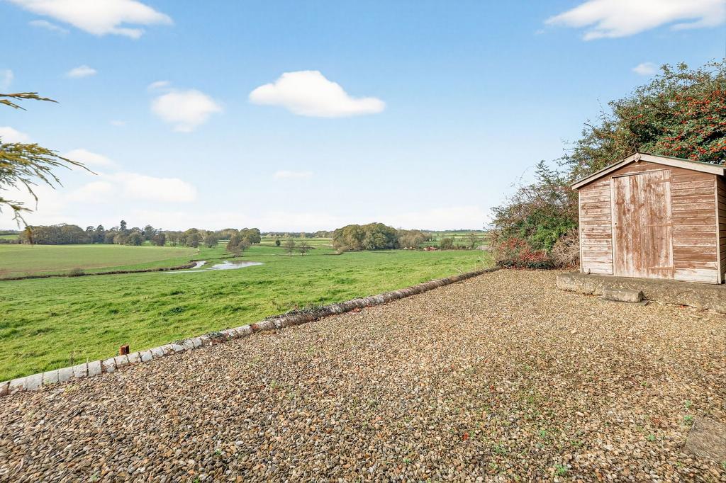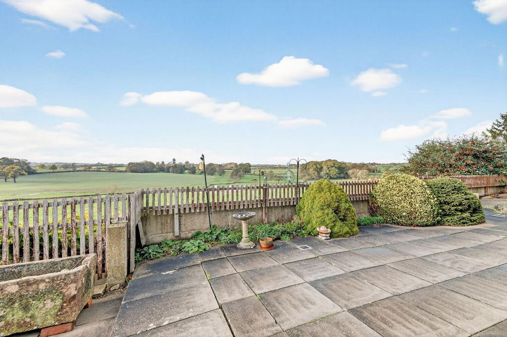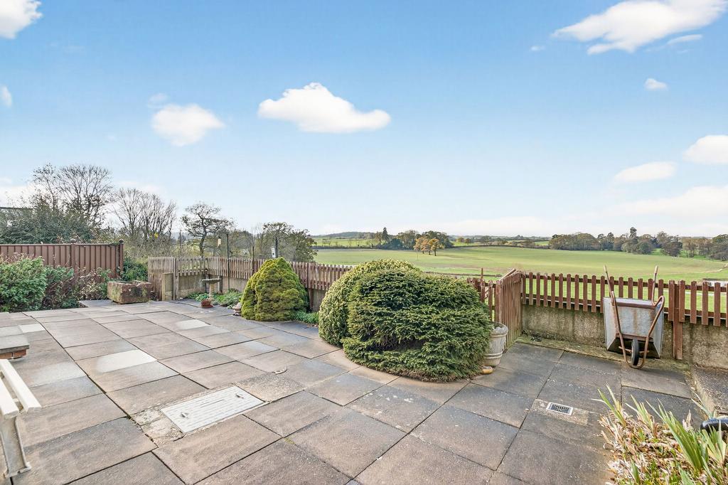The rear garden has been thoughtfully designed for low-maintenance living, offering stunning open countryside views and a truly tranquil retreat. Adjacent to the house is a superb, paved patio with planted borders, while steps lead down to a private gravelled seating area complete with a timber shed.