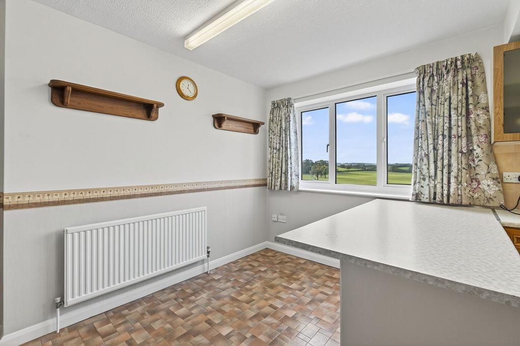 The kitchen/dining room enjoys lovely views over the garden and countryside through two rear-facing windows. It is fitted with an array of shaker-style wall and base units, a one-and-a-half bowl sink, roll-top work surfaces, a double oven, four-ring electric hob, and space for a fridge freezer. There is also ample space for a dining table and chairs, and a door leads through to the utility room.