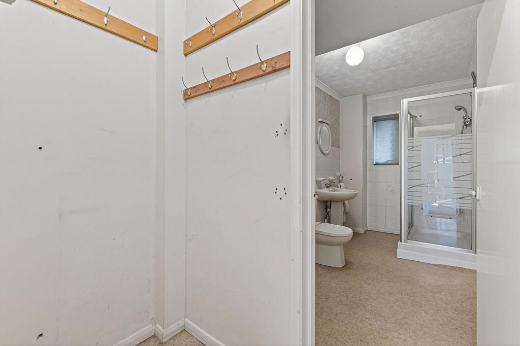 A practical cloakroom provides space for coats and shoes and leads into the ground floor shower room, fitted with a heated towel rail, ceramic wall tiling, and a white three-piece suite including a shower cubicle, pedestal wash basin, and low-level WC.