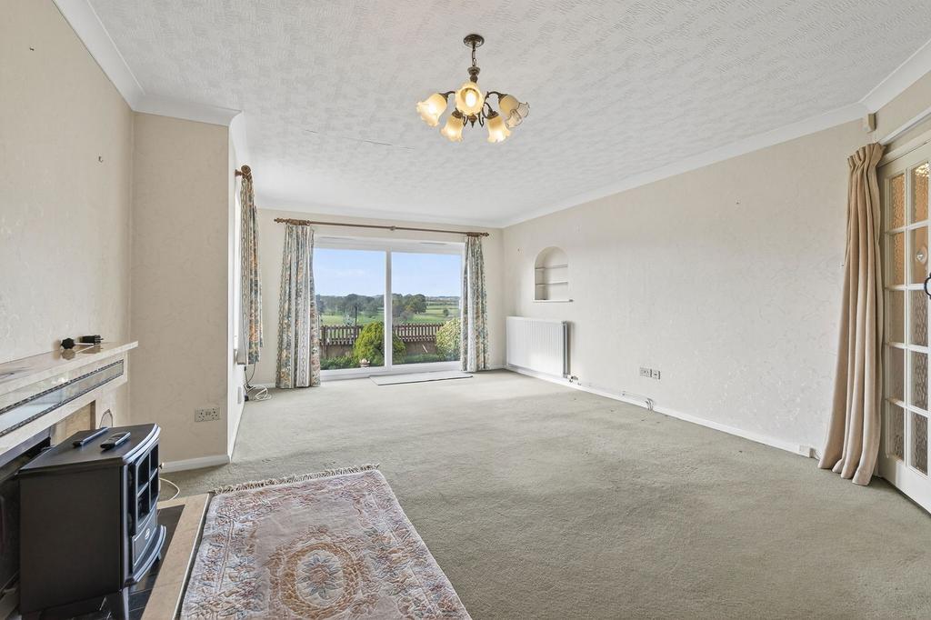A naturally lit entrance porch with terracotta tiled flooring opens into a welcoming entrance hall, which provides access to the majority of the ground floor accommodation, a useful cloakroom, and the staircase rising to the first floor.The beautifully appointed living room enjoys a wonderful triple aspect, flooding the space with natural light. A decorative fireplace creates a charming focal point, while large sliding patio doors offer picturesque views of the rear garden and far-reaching countryside.