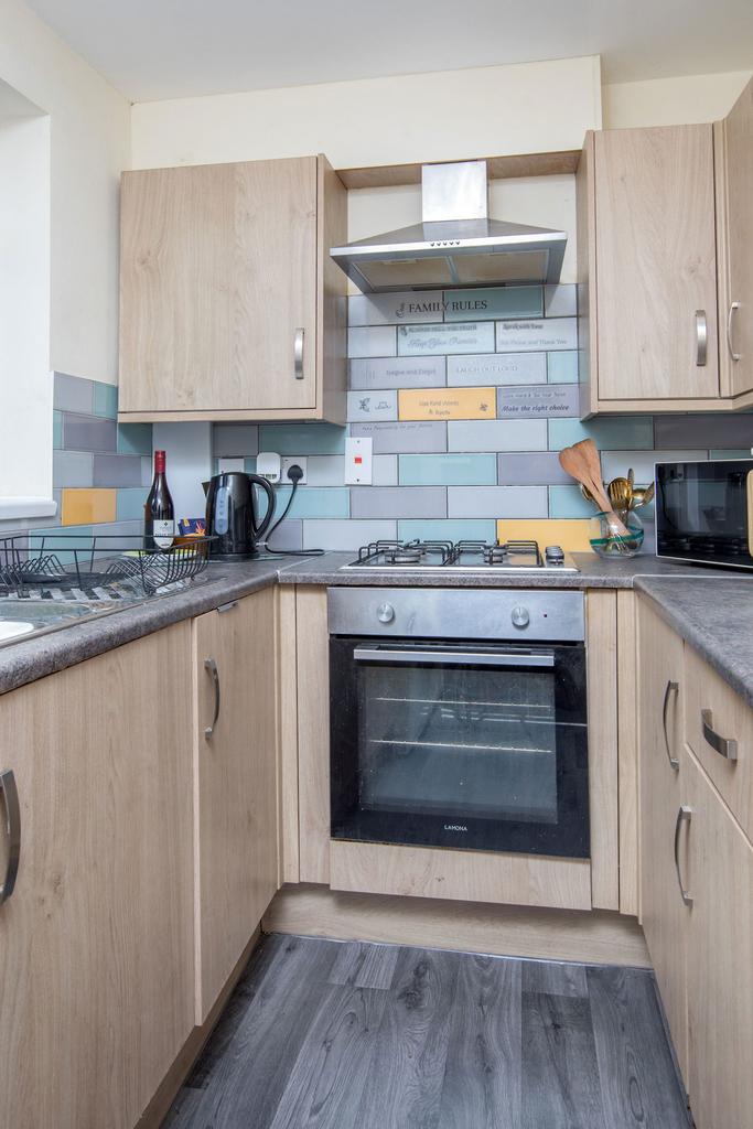 The kitchen is fitted with a modern range of wall and base level units with work surfaces incorporating a sink with drainer and mixer tap with ceramic wall tiled surrounds. There is a built in electric oven, gas hob and extractor hood.