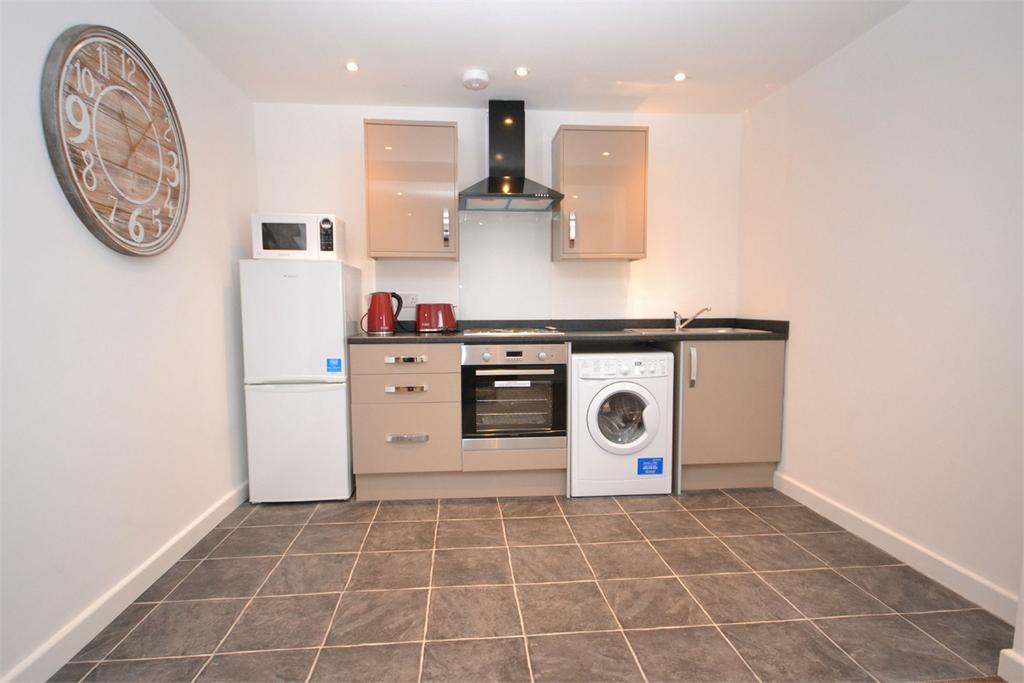 Fitted with a contemporary range of mushroom high gloss laminated units to wall and base with chrome furniture and stone effect laminated work surfaces and splash backs over incorporating a stainless steel drainage sink with chrome mono-bloc tap fitting and four ring electric hob with extractor hood over. Other benefits include electric oven microwave, electric toaster and kettle, washer/dryer, larder fridge and separate freezer, spotlighting and vinyl flooring.
