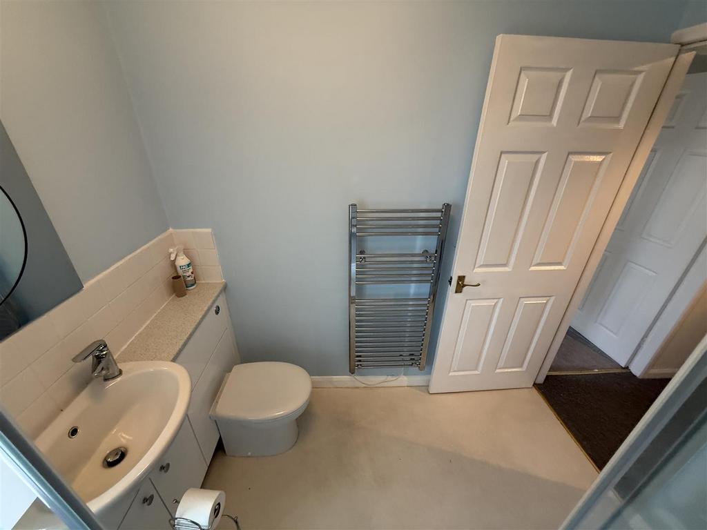 Shower Room - The shower room has a large walk-in cubicle with sliding entrance doors, an aqua boarded interior and a wall-mounted shower attachment extending to a waterfall style second shower head. There is a wash hand basin with storage below and a low-level WC with a concealed cistern. The room also has a storage cupboard, an opaque uPVC window and an upright chrome towel heater.