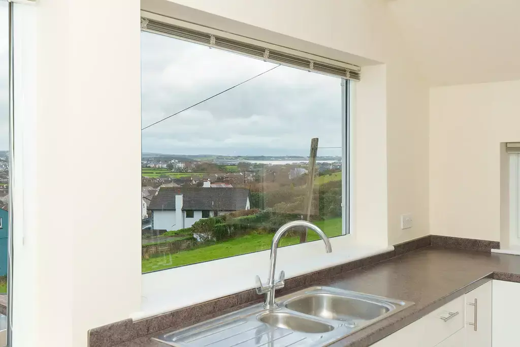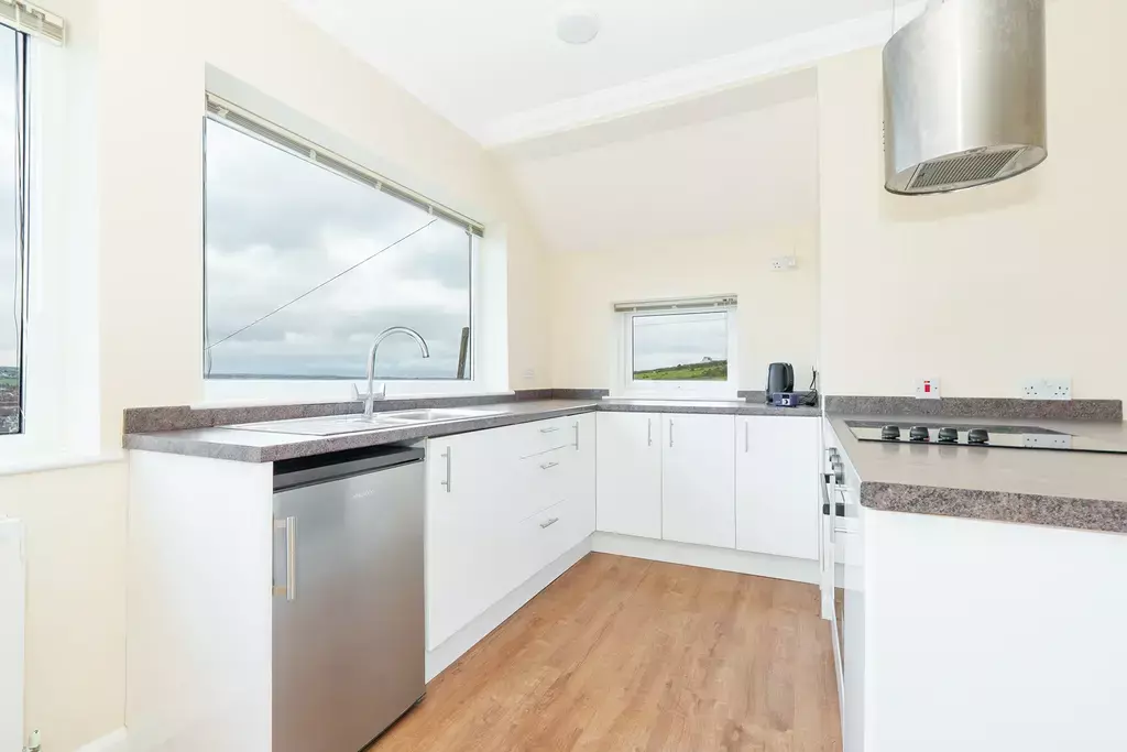 - Modern dining kitchen with breakfast bar and aspecst from the kitchen towards Gansey Bay