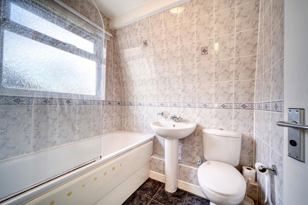 The family bathroom incorporates fully tiled walls and floor with a white three piece suite with a glass shower screen and shower over the bath.