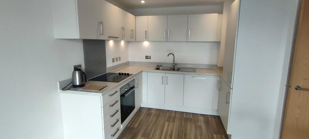 Step inside to discover a contemporary open-plan living and kitchen space, beautifully presented in a neutral palette and finished to a high standard. The kitchen is fitted, with integrated appliances, and generous surface space for meal preparation. The living area boasts floor-to-ceiling windows, flooding the room with natural light and offering fantastic elevated views across the city. There’s ample space for both relaxation and dining, with modern furnishings.