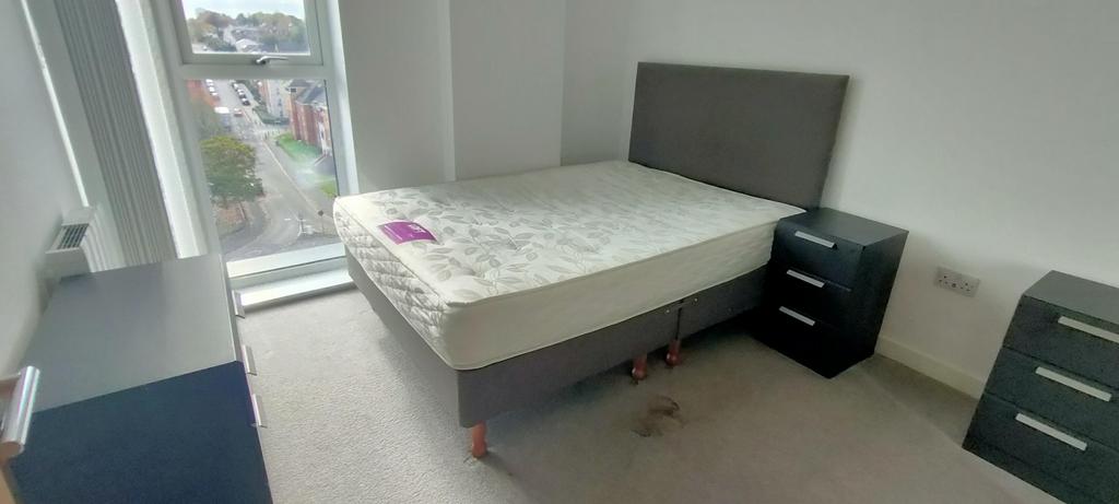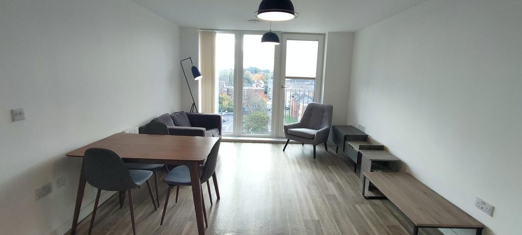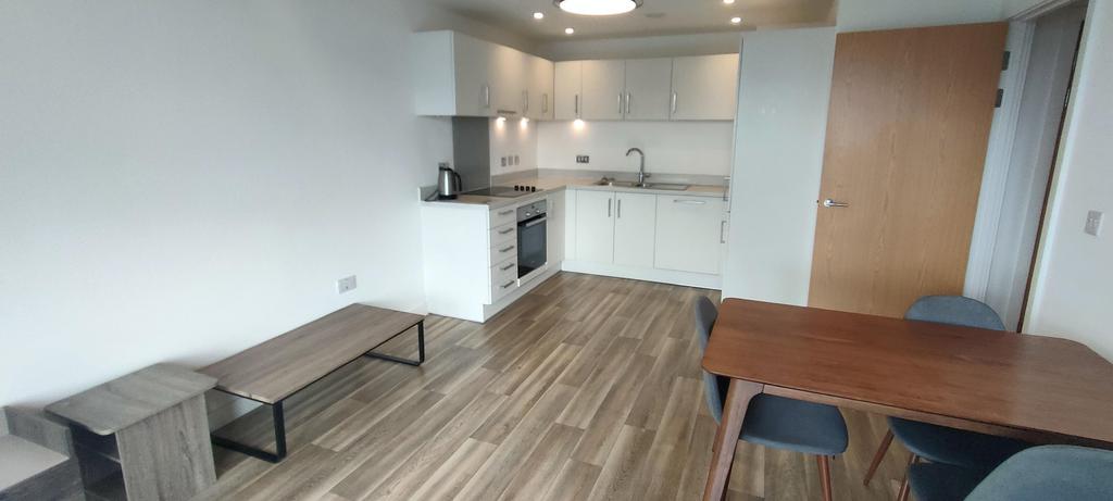 Step inside to discover a contemporary open-plan living and kitchen space, beautifully presented in a neutral palette and finished to a high standard. The kitchen is fitted, with integrated appliances, and generous surface space for meal preparation. The living area boasts floor-to-ceiling windows, flooding the room with natural light and offering fantastic elevated views across the city. There’s ample space for both relaxation and dining, with modern furnishings.