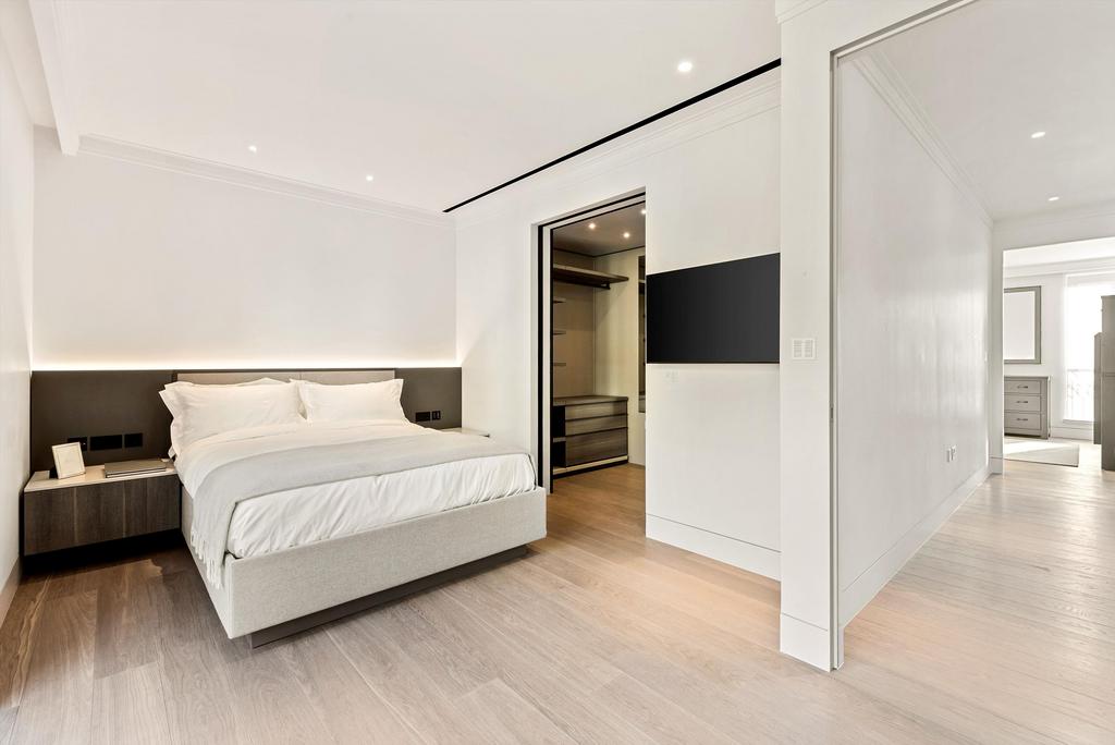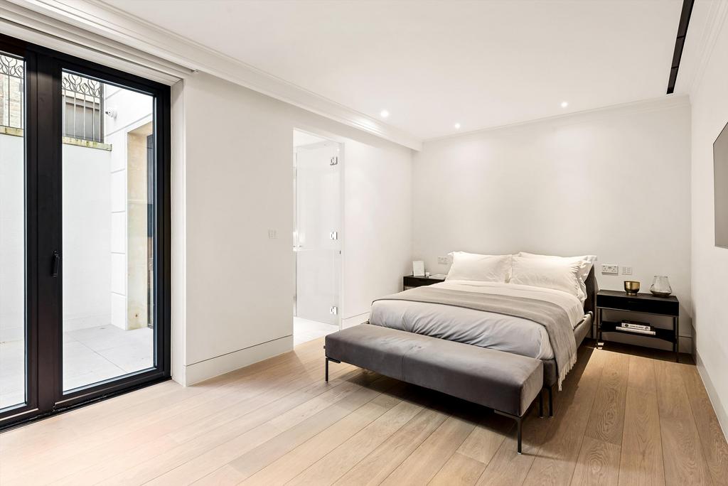 The first floor is made up of a large entertaining area arranged as a living room and separate media room with an Arabescato marble fireplace, a stunning crystal chandelier by Saint Louis, chevron oak parquet flooring, and floor-to-ceiling glazing opening onto either bespoke design ornamental balconies or large outside private terraces. The principal suite located on the top floor consists of a large bedroom, walk-in dressing room, and a marble ensuite bathroom with a freestanding bathtub by Lusso Stone and a rain shower by Fantini. Further bedrooms located either on the second floor or lower ground floor.