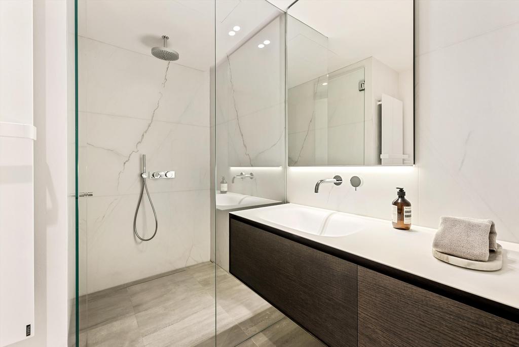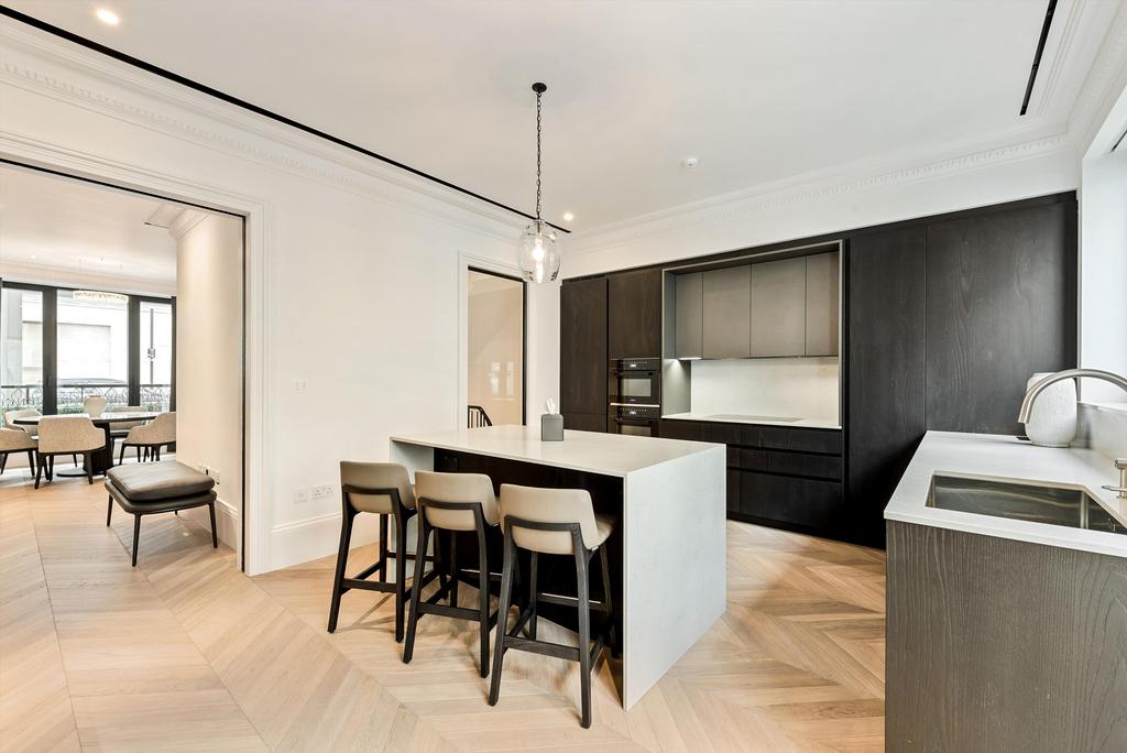 Amenities include air conditioning throughout and an underground parking bay with direct internal access into the property, providing residents with total privacy and additional security. On the ground floor each townhouse has an entrance hall with mosaic flooring laid in Bianco Carrara and Nero Marquina marble, a dining room with an Arabescato marble fireplace, chevron oak parquet flooring, a Swarovski crystal pendant light, and a fully fitted Poliform kitchen with integrated Miele appliances and guest powder room.