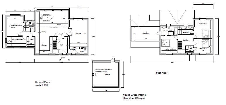 Proposed Dwelling - The proposed two-storey dwelling will comprise - Ground Floor an entrance hall, downstairs cloakroom, lounge, kitchen/dining/family room, ground-floor bedroom, study with shower room, utility, plant room and pantry.