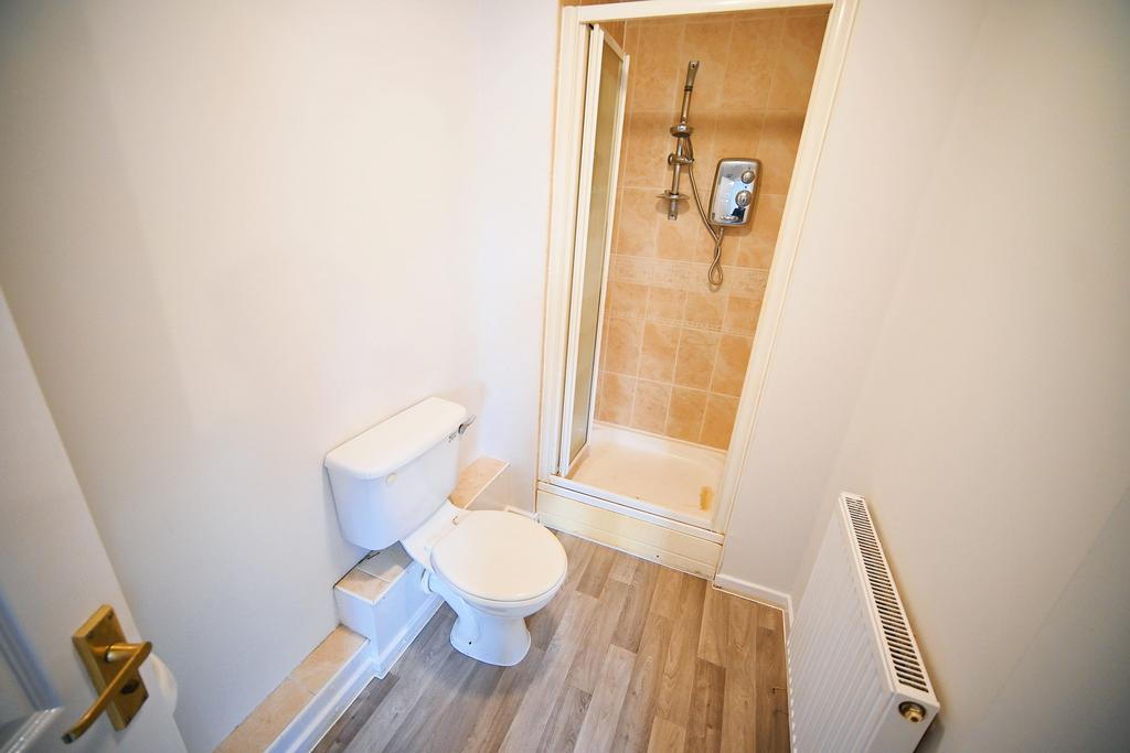 Ensuite Shower Room: 9’5’’ (2.87m) x 4’9’’ (1.45m) White suite with shower cubicle, low level WC, pedestal wash hand basin, radiator, vinyl flooring and extractor fan.