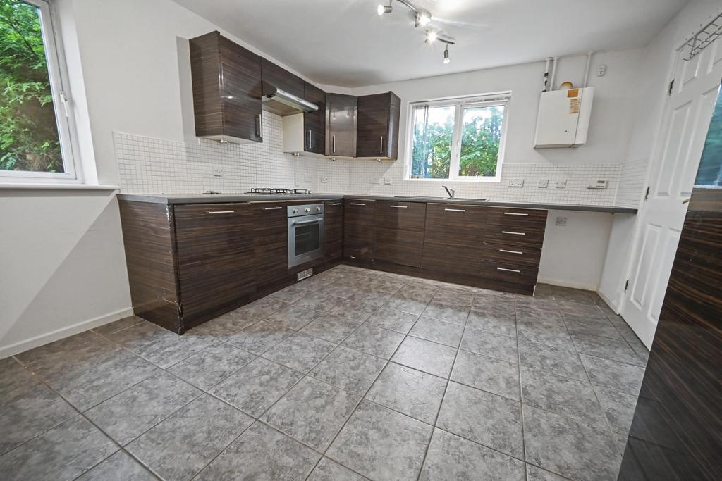 Dining Kitchen: 14’7’’ (4.45m) x 10’11’’ (3.32m) Fitted with a matching suite of laminated dark mahogany style units comprising ceramic 1½ drainer sink unit, range of cupboards, drawers & suspended wall cupboards, matching worktops, built in appliances including built in oven, 4-ring gas hob with extractor hood over, dishwasher, plumbing for washing machine, wall mounted central heating boiler, radiator, ceramic tiled flooring and double glazed windows to front and side.