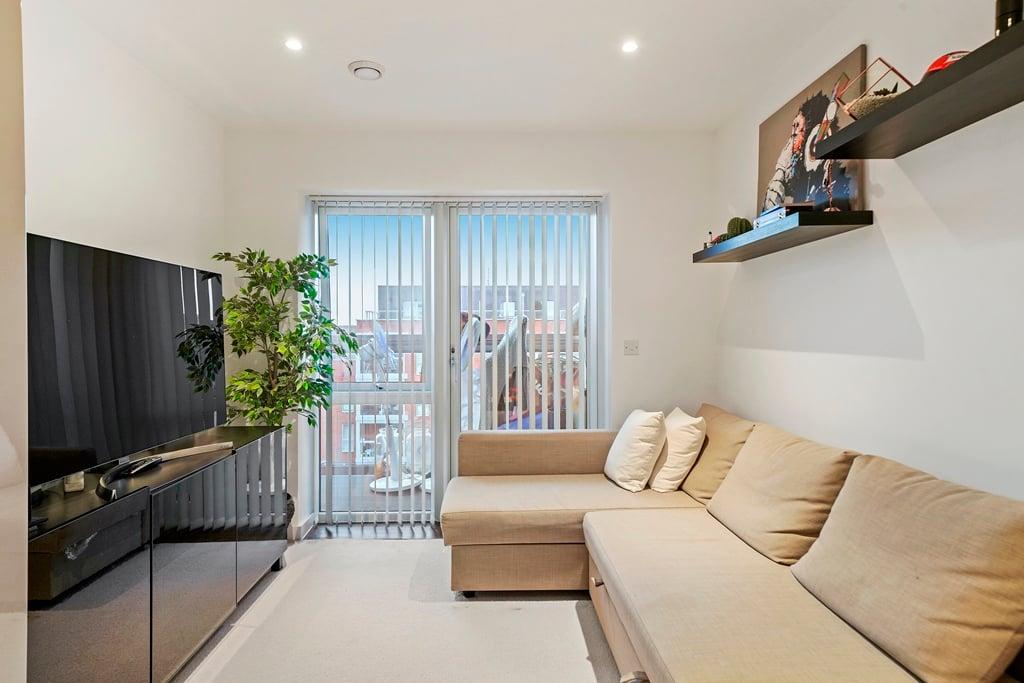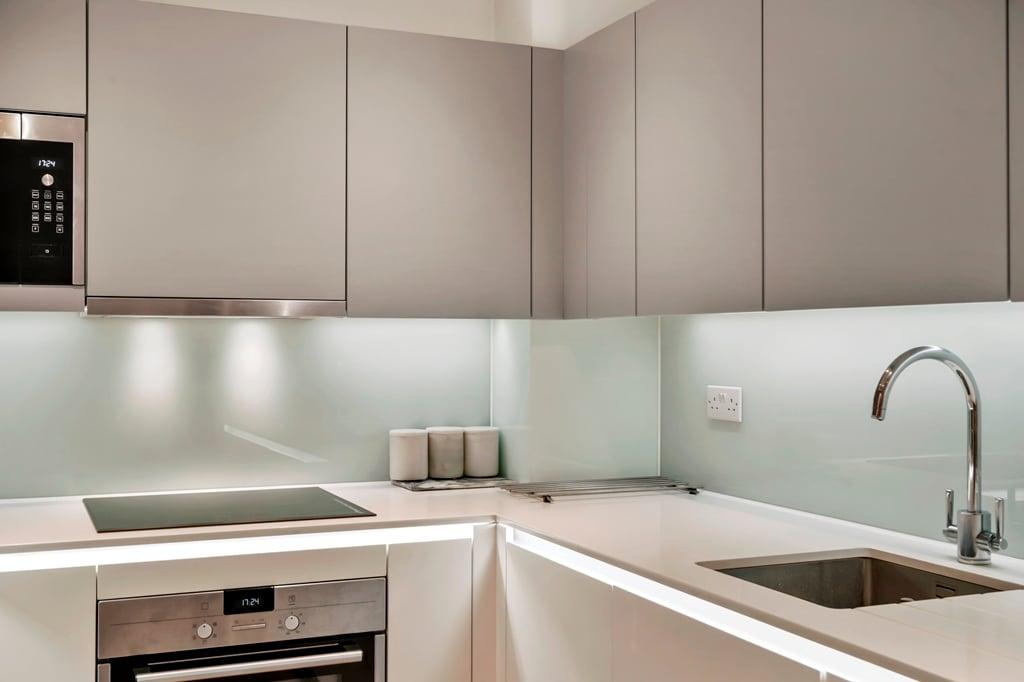 21’5” x 11’4” (6.54m x 3.46m) x 10’2” x 8’0” (3.10m x 2.43m). Lounge area: Wood flooring. Downlights to ceiling. Double glazed door to enclosed balcony which could be opened up in the summer to provide a sun deck. Open plan with Kitchen area: Fitted with a range of matching wall and base cabinets with stone worktops. Downlights to ceiling. Induction hob with oven below and extractor hood above hob. Integrated dishwasher and microwave oven and fridge/freezer. Sink unit with mixer tap.