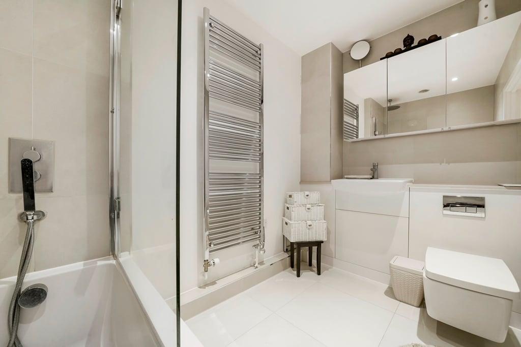 Panelled bath with rain shower above and shower screen. Low level WC with concealed cistern. Wash hand basin with mixer tap. Heated towel rail. Partly tiled walls and tiled flooring.
