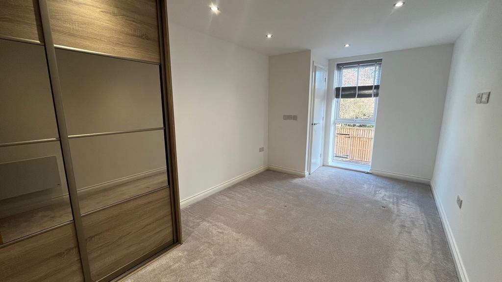 The apartment is located on the first floor and benefits from lift access. The entrance hall leads into an open-plan lounge and kitchen, with the living area enjoying a Juliet balcony overlooking the landscaped grounds. The kitchen is finished in a modern high-gloss design and fitted with integrated Bosch appliances. The bedroom is a generous size and includes a fitted wardrobe, while the shower room offers a contemporary suite comprising a walk-in shower, wash basin, low-level WC and heated towel rail. Additional features include a secure video entry system and on-site parking.