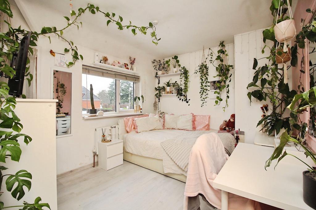 Moving upstairs, the landing leads to three well-proportioned bedrooms, with the master offering a comfortable double space. The second bedroom includes a charming built-in children’s mezzanine, adding a fun and practical feature that makes this home ideal for families. Completing the first floor is a modern bathroom fitted with a three-piece suite, including a bath with shower over, wash hand basin with storage beneath, and WC, complemented by part-tiled surrounds and a heated towel rail. The landing also benefits from a built-in storage cupboard.