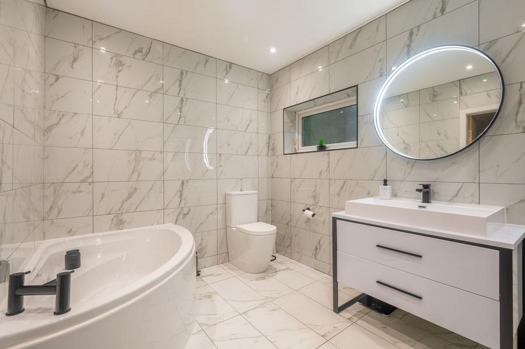 A modern suite comprising of a corner bath, a double walk in shower, wash hand basin and low flush w.c. Complimented with full tiling to the walls, tiled floor, spotlights to the ceiling and a heated towel rail.