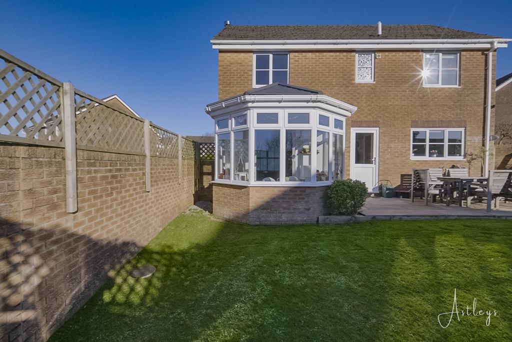 - Driveway, double garage and South Facing rear garden with patio, lawn, and deck.