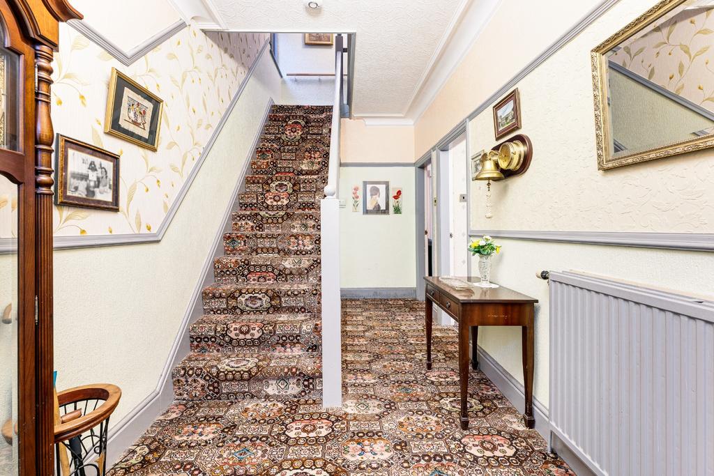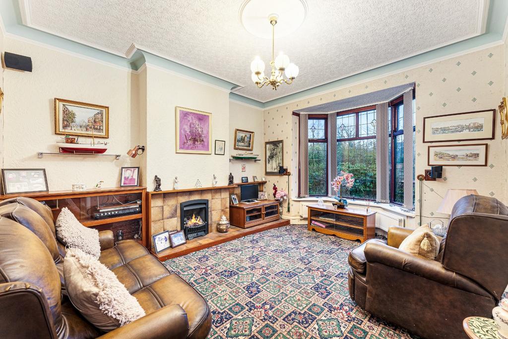 The ground floor features a welcoming entrance hallway leading to two well-proportioned reception rooms. The front lounge benefits from a bright bay window, while the second reception room enjoys a traditional gas fire and chimney breast—perfect for everyday family living. The fitted kitchen provides ample worktop space, splashback tiling and room for appliances, with the added convenience of a separate utility room offering further storage and access to the rear. A sun room completes the ground floor, providing a relaxing space with garden views throughout the year.