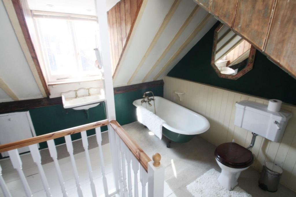 A unique feature of this cottage is the staircase leading from the first floor to a cute and unique bathroom, complete with a charming roll-top bath, wash basin, and WC. The bathroom is presented in a clean and tidy condition, ready for immediate use, offering a delightful space for relaxation.