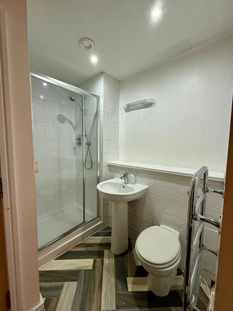 Bathroom - finished beautifully with white tiled walls, laminate flooring, along with a walk-in shower , wash basin, and toilet facilities.