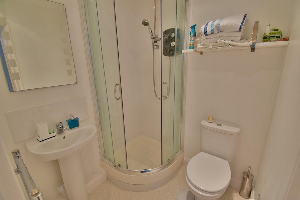 • Good size en-suite shower room finished in a stylish white suite incorporating a corner shower cubicle, pedestal wash hand basin, WC