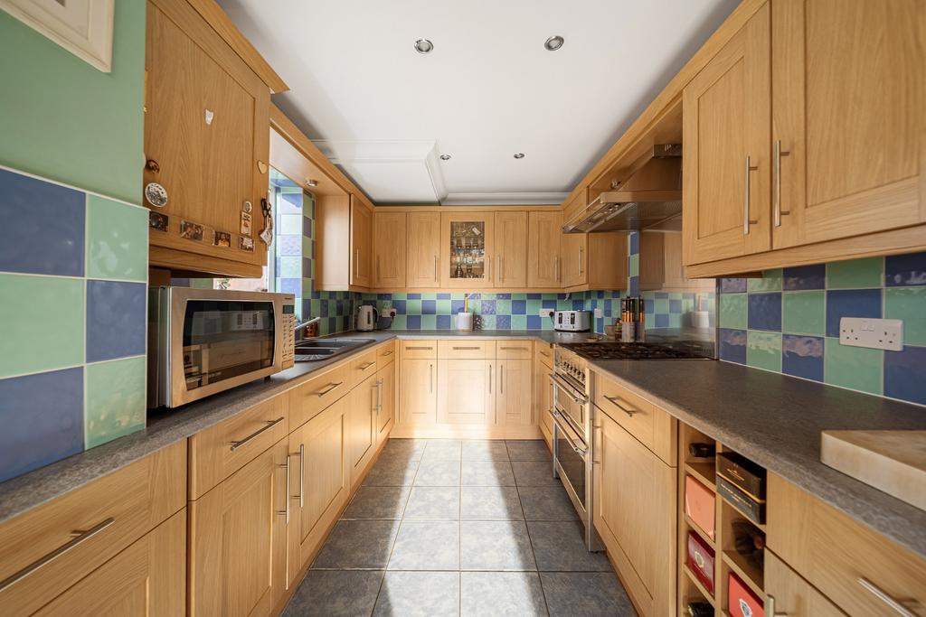 The rear garden is beautifully kept, offering a lawned area, patio space for outdoor dining, and direct access to a large garage, which was rebuilt in recent years and fitted with an electric door.