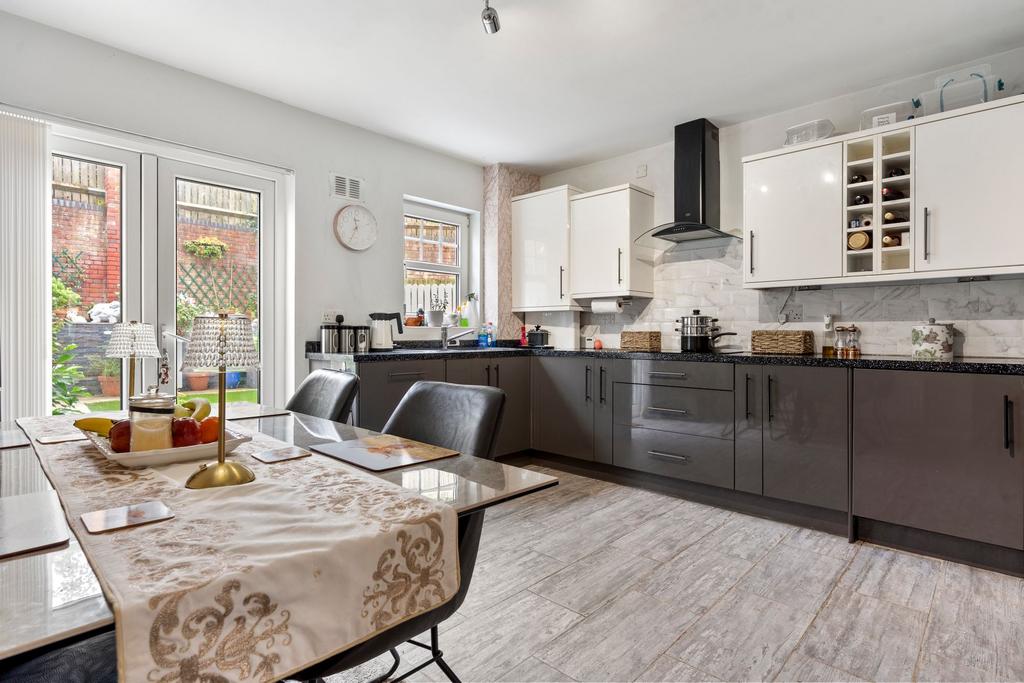 Boasting extended accommodation finished to an impeccable standard, this refined property offers a tranquil haven for family living. Step inside to discover a welcoming lounge with double doors leading to the chic dining kitchen, complete with integrated appliances. Ascend to the top floor to find three cosy bedrooms, with the top bedroom graced by picturesque hill views, in addition to a family bathroom and an en suite shower room.